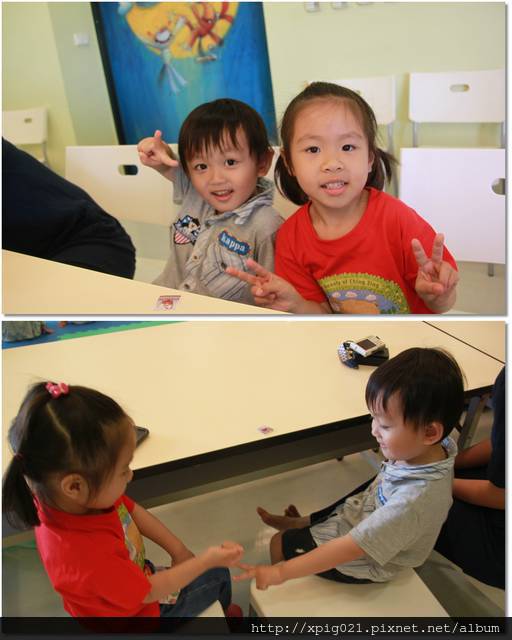 抵達兒美館門口..剛好遇到體能課的阿至跟媽媽..聽完上一場準備來玩沙..