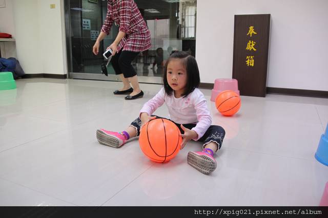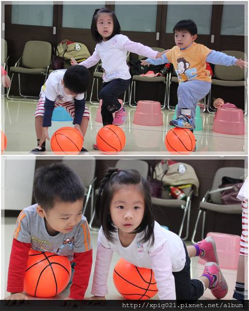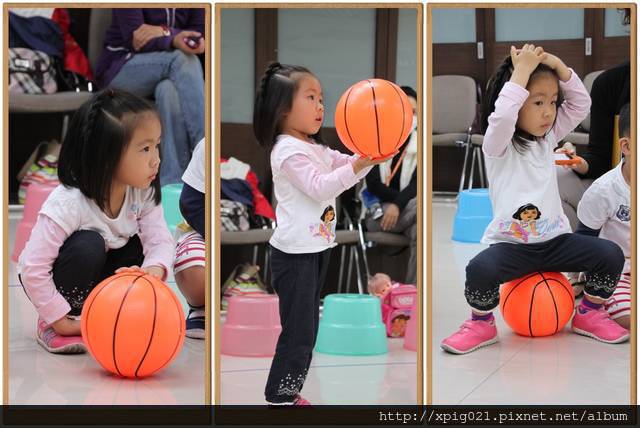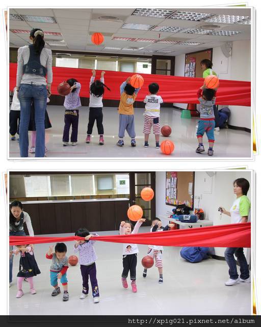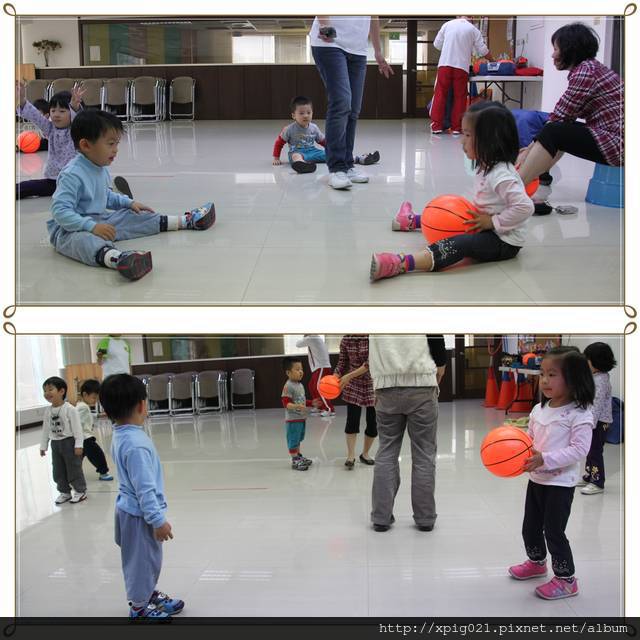 盡量讓小朋友兩兩一組..互相傳接球..如果不願意再由媽咪下場陪玩..