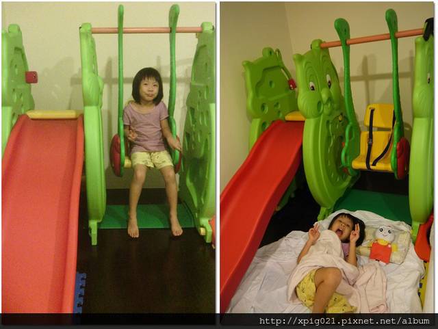我們只好勉強在遊戲室睡一晚..小瑀最開心啦..可以盪鞦韆、溜滑梯..