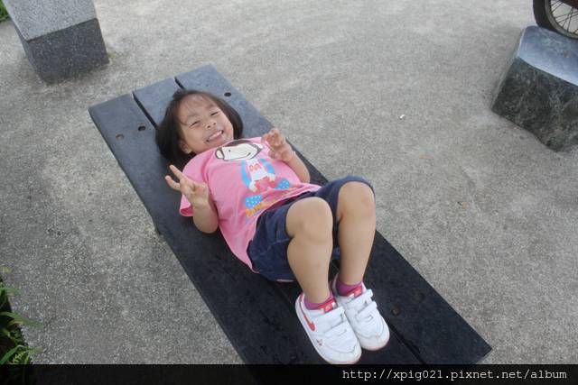 現在..卻是自己很大膽地沿著步道跑跑跳跳..媽咪跟爸比在涼亭休息等她..