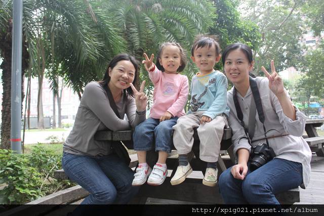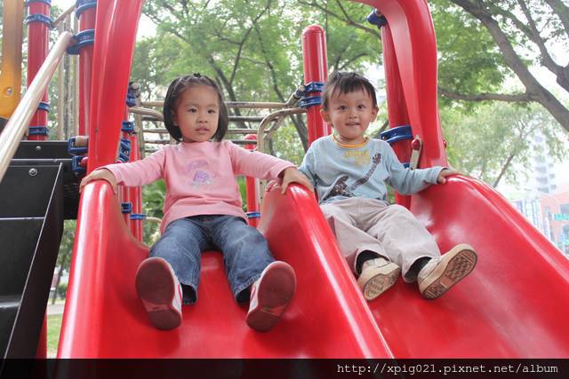 兩位小孩一看到溜滑梯..迫不及待跑去玩..媽咪們安心地坐在一旁聊天、喝飲料..