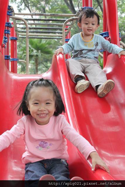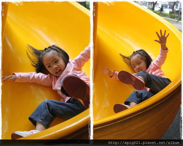小瑀誇張的溜滑梯動作..手跟身體都放開了..