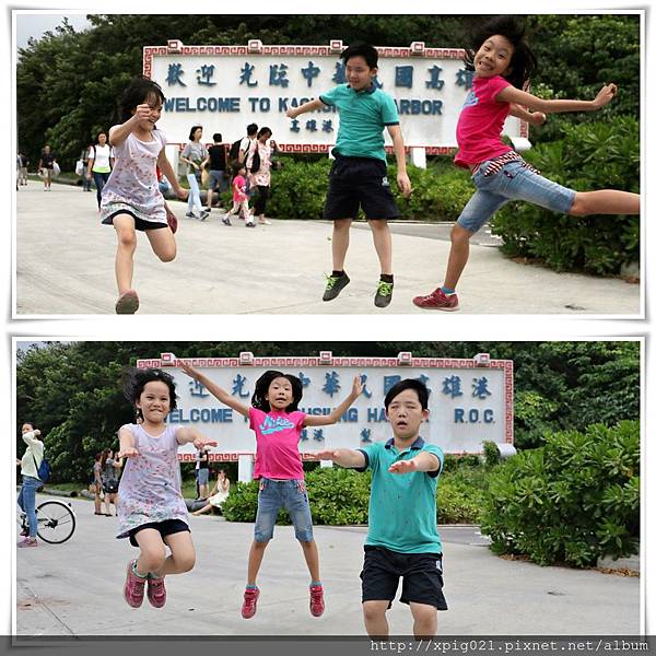 沿著步道走到堤防邊..來到高雄港地標時..小孩們以跳躍的方式紀念到此一遊..