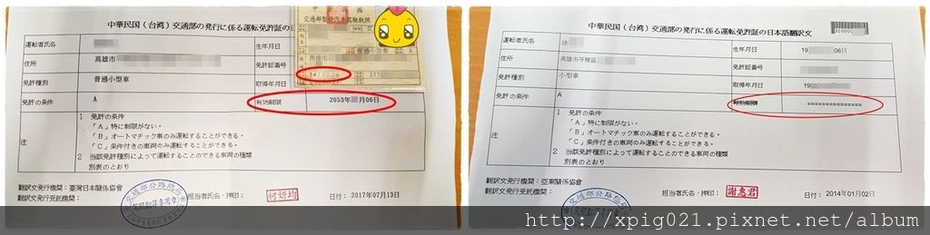 爸比的駕照日文翻譯本是無期限的(下圖右)..但媽咪的翻譯本已過期..