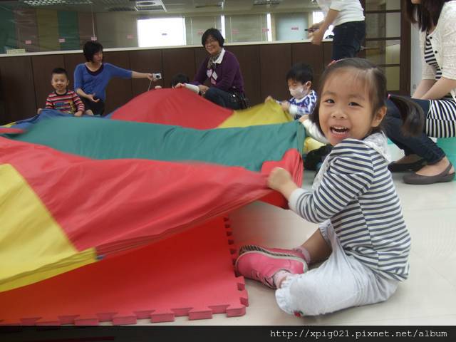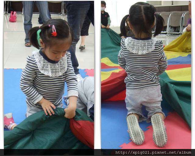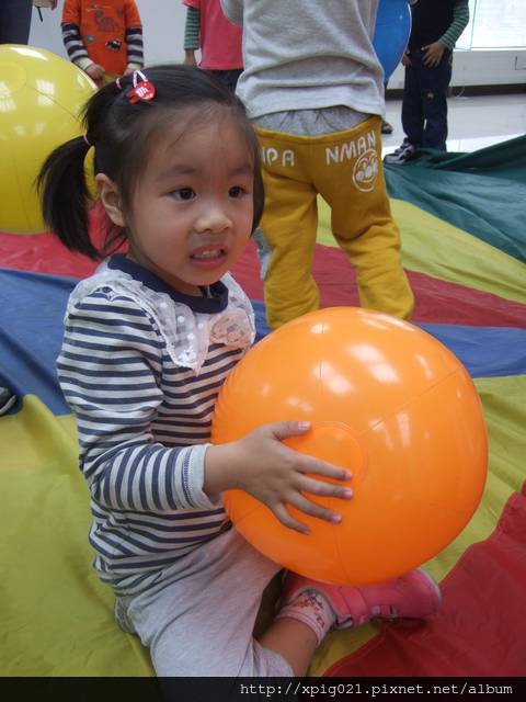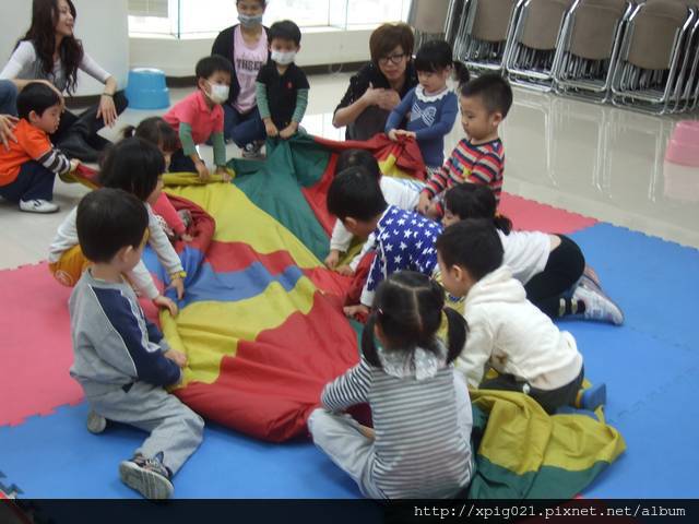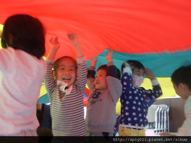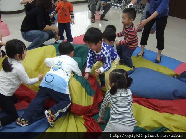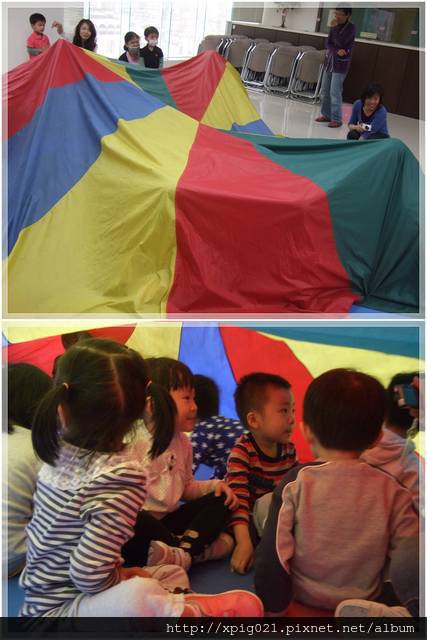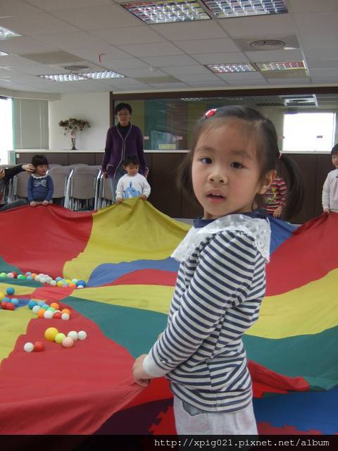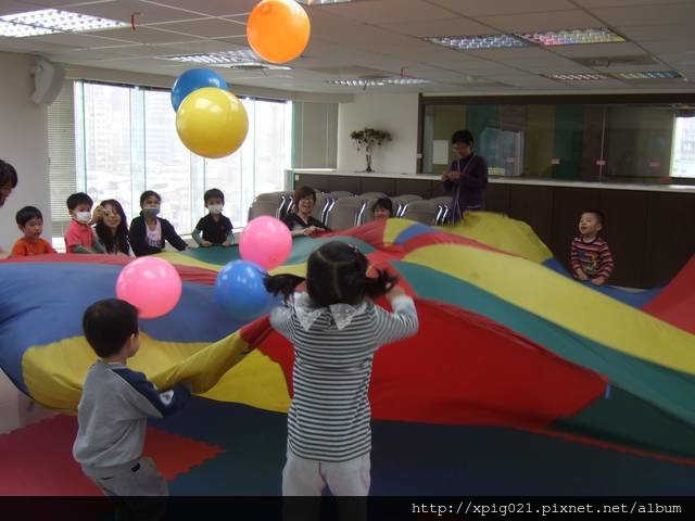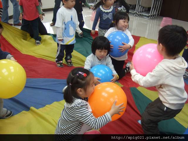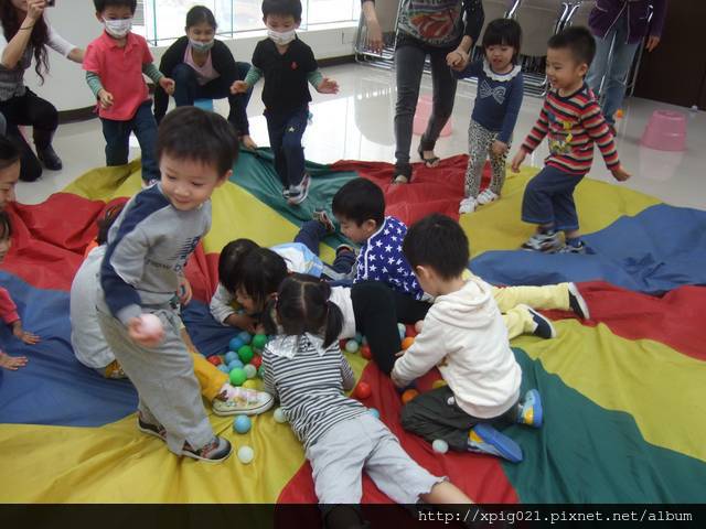 彩色皮球當作貢丸..在小孩拉的帆布上跳動..好像在煮貢丸湯喔..